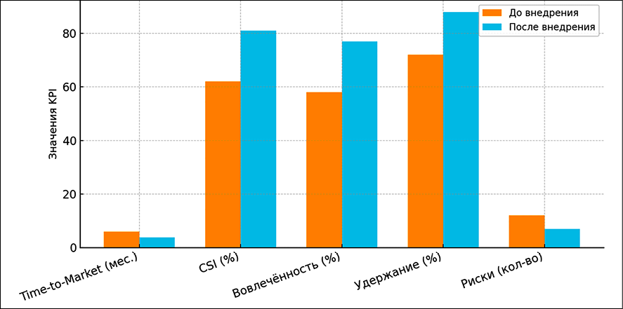 На рис. 2 показаны значения ключевых KPI до и после внедрения лидерских практик.