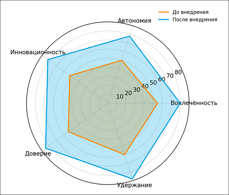 На рис. 3 показаны изменения командных компетенций (вовлеченность, автономия, инновационность, доверие и удержание) до и после внедрения лидерских практик.